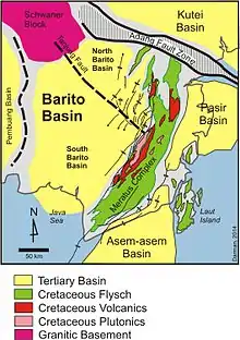 The Meratus Mountains or Meratus Range is a Cretaceous subduction complex, located in southeast Kalimantan (Fig. 5.1). This mountain separate Barito Basin in the west from the Asem-asem Basin which lies to the east. The directions of main folding are NNE – SSW (in the northern part) and NE – SW (in the southern part).
