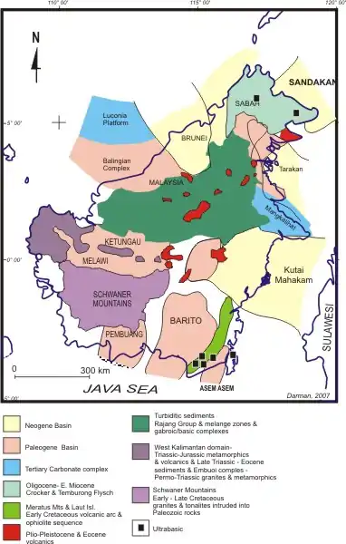 Kalimantan can be divided into several roughly E-W trending tectonic provinces (Figure 5.1). The northern portion of the island is dominated by the Cretaceous and Eocene to Miocene Crocker-Rajang-Embaluh accretionary complex. This consists primarily of turbidites which were being shed northeastward (present day coordinates) off of the Schwaner and younger volcanic arcs into a paralic to deep marine trench basin. These sediments were imbricated, deformed, and weakly metamorphosed during Creraceous and Tertiary subduction and finally were intruded by late stage and post subduction intrusions of the Oligo- Miocene Sintang Group.