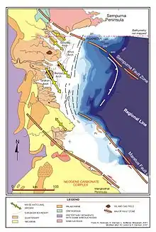 During the early Miocene the sea transgressed westward. Deeper marine deposits reached the present northern Sarawak shelf and a shallower marine wedge extended far into Indonesian waters (Fig. 5). Locally carbonate shoals and buildups fringed the basin (e.g. Subis Limestone, Melinau Limestone, Liechti et al 1960). Extensive coastal plain continental deposits formed along the basin margin, with a particularly thick development in the present area off central/western Sarawak. Northwest to southeast oriented horst and graben tectonics affected the area, but large parts of the area off western Sarawak have subsequently become fairly stable, elevated, and extensively eroded. During the middle Miocene strong subsidence began off central Sarawak along a fault system of a general north- northwest to south-southwest orientation. The middle Miocene sea spread into the depressions that formed on either side of a relatively stable, elevated central area, where extensive carbonate buildups began to form (Central Luconia). At the same time gradually outbuilding deltas came into existence in western and northern Sarawak and in northern Sabah (Fig. 5). During the late Miocene, much of the present area off central and southern Sabah underwent strong folding, initiated through basement uplifts and wrench faulting. Large parts of northern Sarawak, both onto and offshore, were also affected by this tectonic phase, though deformation generally has been weaker. Synsedimentary deformation took place in the thick sedimentary sequences that filled the deep depressions on either side of the Central Luconia carbonate platform. Deltaic outbuilding continued in western and central Sarawak and new deltas developed in southern and eastern Sabah (Fig. 5). During the Pliocene, the sea rapidly expanded over the northward tilting shelf, depositing open-marine clays and sands (Fig. 5). On the shelf slope, thrust folds developed far offshore. Synsedimentary deformation continued in the deltaic areas, while another folding phase, probably again triggered by trough basement uplifts and wrench faulting, affected large parts of nearshore northern Sarawak and particularly northern Sabah (Figs. 3, 4).