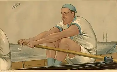 “[U]ndoubtedly the greatest oar ever produced by Cambridge” and the first Cantab to win the Boat Race four times, Stanley Duff Muttlebury (1866-1933) appeared in Vanity Fair at the end of his third year as C.U.B.C. President and at the apex of his career, having captained Leander in 1889. (He was the only VANITY FAIR rower to be shown in a boat -- with fixed pins, as swivels had not yet been accepted -- which he facilitated by letting Leslie Ward watch him practice rowing on the floor of his college room.) Muttlebury’s success came in part, as R.C. Lehmann wrote, from sheer strength: “His blade sweeps through the water, as he swings his 13.10 / And pulls it all, and more than all, that brawny king of men.” But success also came from effective use of a long slide, a refinement Muttlebury developed in the mid-1880s at Trinity College while Reginald McKenna was doing the same next door at Trinity Hall, both with the help of Steve Fairbairn. In the resulting debate between “orthodoxy” and “Fairbairnism,” which flared again fifty years later in The Times, R.P.P. Rowe, the younger brother of Vanity Fair’s G.D. Rowe, pointed to “Muttle” as the exemplar of both styles: