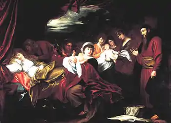 Just as Jacob left, Esau returned from the hunt, prepared a dish for Isaac, and asked Isaac for his blessing. Isaac asked who he was, and Esau said that it was he. Isaac trembled and asked who it was then who had served him, received his blessing, and now must remain blessed. Esau burst into sobbing, and asked Isaac to bless him too, but Isaac answered that Jacob had taken Esau’s blessing with guile. Esau asked whether Jacob had been so named that he might supplant Esau twice, first taking his birthright and now his blessing. Esau asked Isaac whether he had not reserved a blessing for Esau, but Isaac answered that he had made Jacob master over him and sustained him with grain and wine, and asked what, then, he could still do for Esau. Esau wept and pressed Isaac to bless him, too, so Isaac blessed him to enjoy the fat of the earth and the dew of heaven, to live by his sword and to serve his brother, but also to break his yoke.