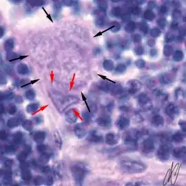 2. early spermatogonium B (eSgB) [arrows]: morphologically indistinct from SgA, appears in clusters of 2-4 cells. Note a single Sertoli cell [red arrows], which are only occasionally observed; on the other hand, Sertoli cells are prominent after exposure to androgen or anti-androgen. |