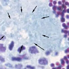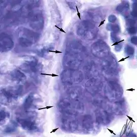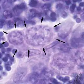 1. spermatogonium A (SgA) [arrows]: large single cell, with a large hypochromatic nucleus; early spermatogenic stages do not stain with Putt's carbol fuchsin. SgA divides mitotically to renew itself and to produce: |