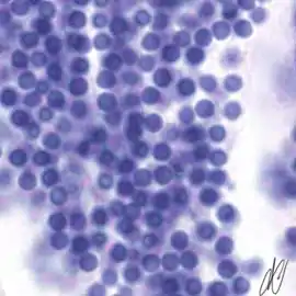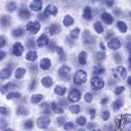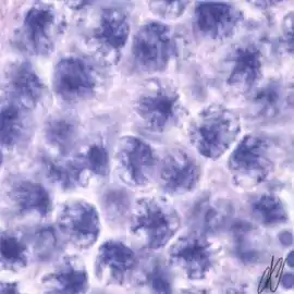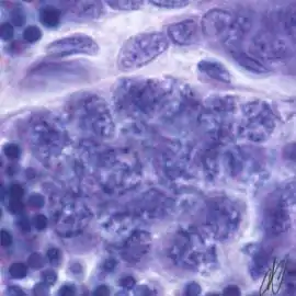 7. spermatocyte, leptotene stage of meiotic prophase, progressing to the zygotene stage; Note that there is staining with Putt's carbol fuchsin from this stage on, although still faint here. |