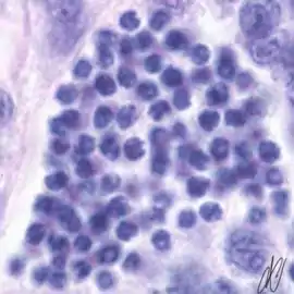 5. late spermatogonium B: clusters >4 cells [arrows]. Late SgB divides to yield smaller primary spermatocytes. Primary spermatocytes undergo meiosis, which consists of DNA duplication (yielding tetraploid cells: two copies of each chromosome, each copy consisting of two sister chromatids), genetic recombination, and two maturation divisions. The product of the first maturation division are secundary spermatocytes (diploid: one copy of each pair of chromosomes, consisting of two sister chromatids), the second maturation division yields spermatids (haploid). The first maturation division takes days, and therefore the successive stages of this division can easily be discerned: |