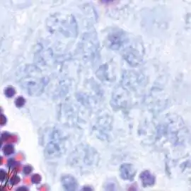 11. dividing primary spermatocytes (diplotene stage); the metaphase, anaphase, and telophase of the first meiotic division (respectively equatorial arrangement of chromosomes, movement to cell poles, and actual division of the cell) are completed quickly, and are therefore only present briefly. The daughter cells of the first meiotic division are known as secundary spermatocytes (diploid). The second meiotic division is also completed quickly, and therefore secundary spermocytes are neither easily discernible. The resulting cells of the second meiotic division are: |