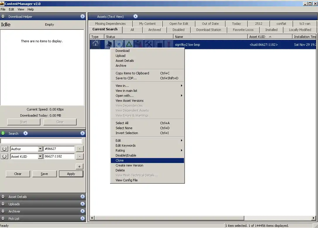 and step one is to clone the asset in Content Manager. Note this sign is Trainz version 1.5; it doesn't require any features of the later versions. Right click the asset and click on clone. (For TRS 2004 see above, second paragraph; in Trainz12 an error that the asset uses an obsolete trainz-build number (numbers below 2.7 are not supported. However, TRS12 will correct this limitation when you commit your new asset). TS12 will give you a warning about obsolete build number but this can be ignored.