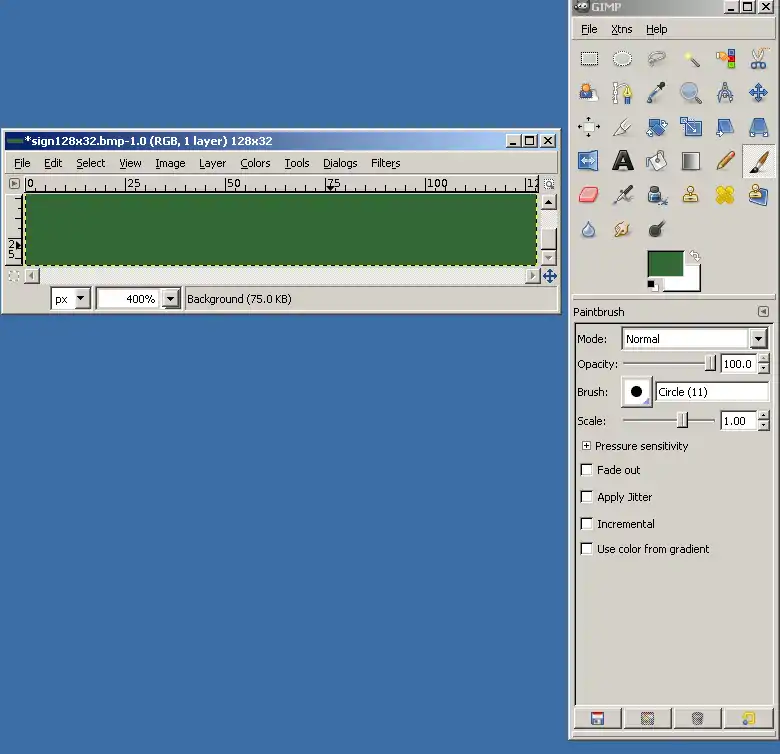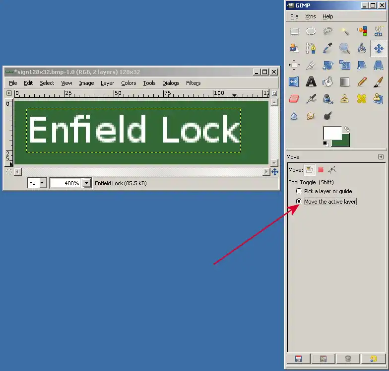 Just below the image is the scale, for ease of use raise this to 400% and increase the window size of the panel. Use the eye dropper tool to pick up the background colour then the paint brush to remove the existing lettering.