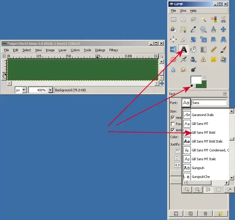 GIMP is particularly strong in adding lettering. Note the background / foreground colour squares click on the curved arrow to reverse these to get white lettering. Click on the lettering tool, the letter "A" and select a font, "Gill Sans MT Bold" is fairly useful. It is possible to add fonts to GIMP. You can adjust the font size directly.