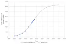 Raw data on the number of tonnes loaded annually in the global container shipping market from 1960 to 2016[17] was used to estimate a three-parameter logistic function: