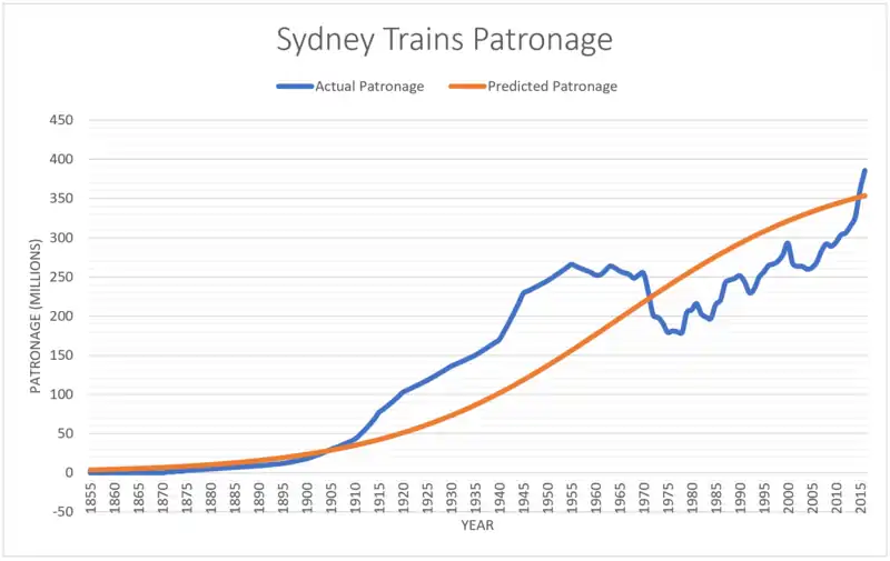 The saturation status K level is predicted to be close to actual values gathered by Transport for NSW. The logistic function considers the entire lifespan of the system, thereby attempting to normalise unusual trends and outliers. A Rsquared value of 0.8366 suggests a mediocre fit to curve. This is due to the unusual growth trends from 1970 onwards. The post maturation phase, a regeneration of the growth curve, does not fit in with standard S curves. By omitting data from 1955 onwards, a Rsquared value of 0.976 is generated. Sydney trains was approaching a state of maturation before reform and privatisation of its freight sector breathed new life into the system. A better method would be to separate the lifespan of Sydney Trains into 2 eras, pre and post reform. The three-parameter logistic function is suitable pre reform whilst a logarithmic function with a new gradient A is recommended post reform.