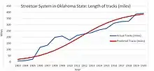 The plotting of the actual length of the electric streetcar system in years 1903 to 1920 in the State of Oklahoma indicated growth in the period 1905 to 1909 and then a sharp drop in the following year to 1910. From about pre-World War I period up until 1920 the actual results still show growth but at a decelerating rate