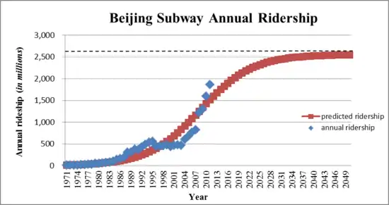 With all the variables were found to solve for S (t), predicted ridership could be determined for each year. The resulting data is plotted in red in Figure 1. It forms an S-curve that fits the actual data as accurately as possible.