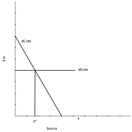 The notion of damages and protection is compatible with the idea of supply and demand, as illustrated in the figure to the right. Here, the change in damages with output () is the demand curve (the marginal willingness to pay to avoid damage), and the change in protection (attenuation) with output is the supply curve (marginal cost) and represented as (). Again, the slopes of the curves are speculative: