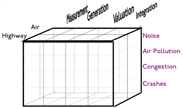 Associated with the interest in social and external cost has been a continual definition and re-definition of externalities in transportation systems. Verhoef (1994)[8] states “An external effect exists when an actor’s (the receptor’s) utility (or profit) function contains a real variable whose actual value depends on the behavior of another actor (the supplier) who does not take these effects of his behavior into account in this decision making process.” This definition eliminates pecuniary externalities (for instance, an increase in consumer surplus), and does not include criminal activities or altruism as producers of external benefits or costs. Rothengatter (1994) [9] presents a similar definition: “an externality is a relevant cost or benefit that individuals fail to consider when making rational decisions.” Verhoef (1994) divides external cost into social, ecological, and intra-sectoral categories, which are caused by vehicles (in-motion or non-in-motion) and infrastructure. To the externalities we consider (noise, congestion, crashes, pollution), he adds the use of space (e.g. parking) and the use of matter and energy (e.g. the production and disposal of vehicles and facilities). Button (1994) [10] classes externalities spatially, considering them to be local (noise, lead, pollution), transboundary (acid rain, oil spills), and global (greenhouse gases, ozone depletion). Gwilliam and Geerlings (1994) [11] combines Verhoef’s and Button’s schemes, looking at a Global, Local, Quality of Life (Social), and Resource Utilization (air, land, water, space, materials) classification.
