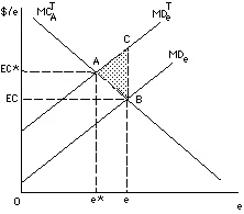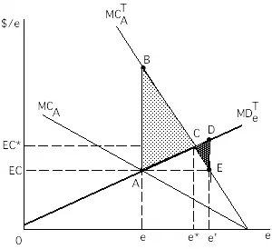e' > e* so we have too high a level of emissions. Pollution damages will increase by the amount e*CDe' but the abatement costs will be reduced (because of higher allowed emissions) by e*CEe'. Therefore, the net social loss will be CDE. Generally, there is no reason to expect CDE = ABC but it has been shown that
