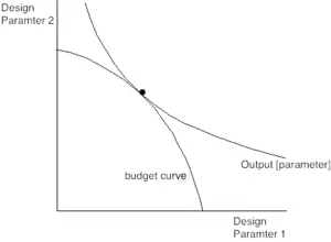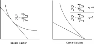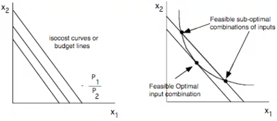 The isoquant model can be used to illustrate the solution of finding the least cost way of producing a given output or, equivalently, the most output from a given budget. The innermost budget line corresponds to the input prices which intersect with the budget line and the optimal quantities are the coordinates of the point of intersection of optimal cost with the budget line. The solution can be an interior or corner solution as illustrated in the diagrams below.