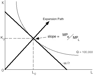 The equilibrium point, the optimal mix of inputs, is that point at which the rate at which the firm can trade one input for another which is dictated by the technology, is just equal to the rate at which the market allows you to trade one factor for another which is given by the relative wage rates. This equilibrium point, should be anticipated as equivalent to a point on the cost function. Note that this is, in principle, the same as utility pace and output space in demand. It also sets out an important factor which can influence costs; that is, whether you are on the expansion path or not.