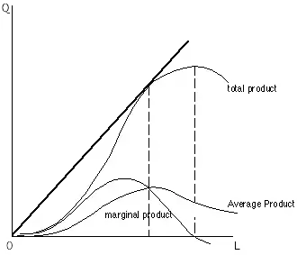 Note that average product (AP) rises and reaches a maximum where the slope of the ray, is at a maximum and then diminishes asymptotically.