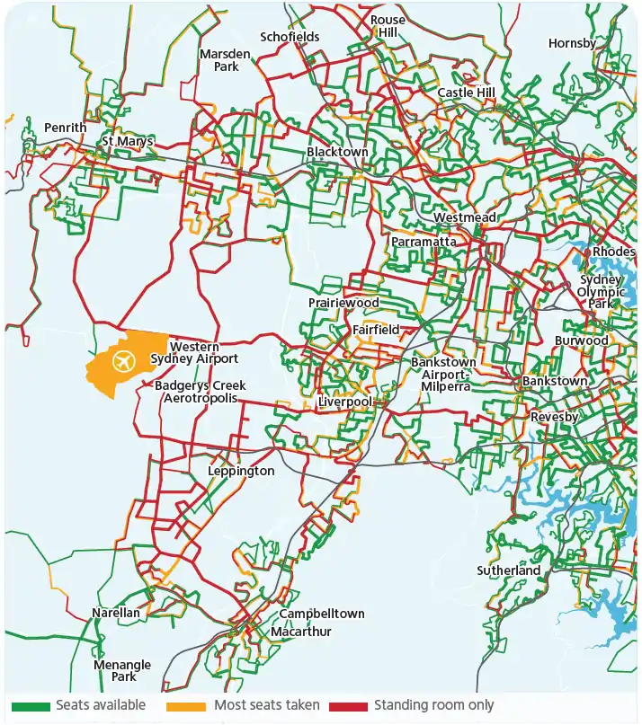 Many of the heaviest demand corridors in the 2030s will be related to Western Sydney, the figure below shows the forecast bus demand in Western Sydney in 2056 without rail links, with red indicating demand to be higher than seated capacity.
