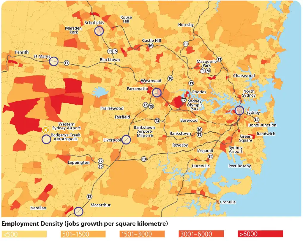 The Western Parkland City:- This is areas of Greater Western Sydney around new international Western Sydney Airport and Badgerys Creek Aerotropolis along with areas of established centres of Liverpool, Greater Penrith and Campbelltown-Macathur. The vision of this city is focused on developing strong trade, freight, logistics, advanced manufacturing, health, education and science economy leading to knowledge-intensive jobs close to areas of high population growth.