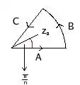 In order to get obtain the integral of from 0 to , let us consider the path consisting in a line going from 0 to , then the arc of radius from the angle 0 to and then the line joining the end point of and the initial point of ,