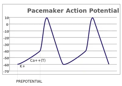 - inward sodium/calcium (slow depolarization; SA/AV cells have no resting membrane potential)