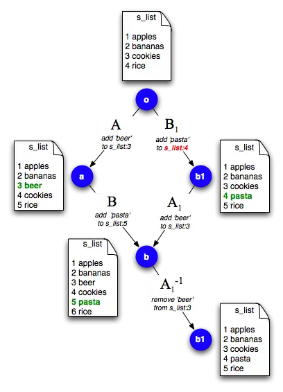 The problem is one of context, specifically speaking, the context between and . In order for instructions like "add pasta to line 5 of s_list" to make any sense, they have to be in the correct context. Fortunately, commutation is easy to do, it produces two new patches and which perform the same change as and but with a different context in between.
