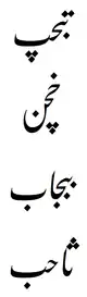 Care must be taken to distinguish چ from پ, which has the same diacritics. In particular, چ in its medial form is often confused for پ.