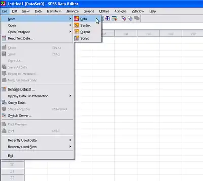 If you'd rather enter data into a blank data file, you can create an empty SPSS data file. To do so, once you've opened the program, click "File" → "New" → "Data"