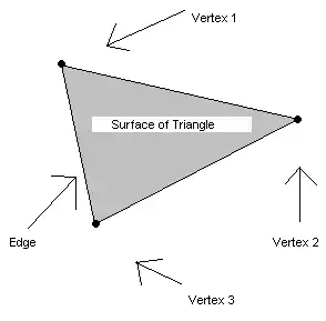 - Triangle - It is defined by 3 vertexes. I could say that vertex 1 vertex 2 and vertex 3 make a triangle. That would give me a surface. The area inside the triangles borders, is also part of the triangle. The triangle is a surface. A triangle can be rendered, and would appear solid.