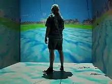 One form of immersive virtual reality is the cave automatic virtual environment (also known by the acronym CAVE). In this form, projectors create images on three to six of the walls in a room-sized cube. The name refers to the cave allergory in Plato's Republic, in which a philosopher ponders the nature of reality, illusion, and perception.