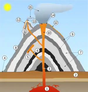 9. Layers of lava emitted by the volcano 10. Throat 11. Parasitic cone 12. Lava flow 13. Vent 14. Crater 15. Ash cloud |