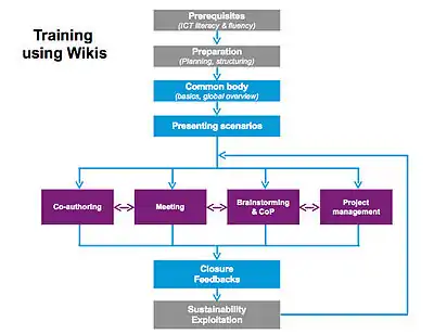 - Quite a few prerequisites, aiming that no one starts the face-to-face training without theories and practices; anyone should see that wikiculture is an entire emerging "sustainable" socio-economical environment, not only a software or an encyclopedia. These prerequisites should take a maximum 45 minutes (ideally 20-30 minutes), so that the participants are already involved when they start the training, but not overcharged of preliminary work either.