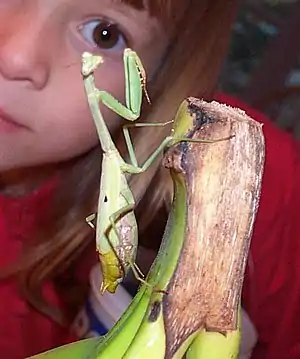 The mantis is a carnivorous ambush predator. Mantes eat other insects which they catch with their spiny front legs. The rows of spines act like hooks, so they can grab and hold their prey. There is almost no way to escape. The mantis' strong arms and hooked claws are a deadly trap. Their camouflage helps them stay hidden and they are so fast they can snag prey in the blink of an eye. Some species of mantes also eat lizards, spiders, other mantes, and even small birds and mice.