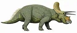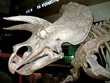 Triceratops means "Three Horned Face" in Greek. It is called that because it has three horns – two above its eyes and one on its nose. Triceratops horns could be up to 115 cm (45 inches) long. It had a big frill that extended up above the head.