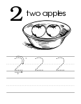 - Handwriting worksheet for the number 2 (two) with color-in apples in bowl