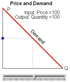<?xml version="1.0" encoding="utf-8"?> <html xmlns="http://www.w3.org/1999/xhtml" xmlns:xf="http://www.w3.org/2002/xforms" xmlns:ev="http://www.w3.org/2001/xml-events" xmlns:xsd="http://www.w3.org/2001/XMLSchema" xmlns:xsi="http://www.w3.org/2001/XMLSchema-instance" xmlns:svg="http://www.w3.org/2000/svg" xmlns:xlink="http://www.w3.org/1999/xlink" xmlns:xi="http://www.w3.org/2001/XInclude"> <svg xmlns="http://www.w3.org/2000/svg" xml:space="preserve" width="300" height="450" onload="OnLoadEvent(evt)"> <defs> <g id="arrowMarker"> <g stroke="black" stroke-width="1"> <line x1="6" y1="-2" x2="0" y2="0"/> <line x1="6" y1="+2" x2="0" y2="0"/> </g> </g> <marker id="startMarker" markerWidth="48" markerHeight="24" viewBox="-4 -4 25 5" orient="auto" refX="0" refY="0" markerUnits="strokeWidth"> <g> <use xlink:href="#arrowMarker" transform="rotate(180)" stroke-width="1" stroke="black"/> </g> </marker> </defs> <!-- Title --> <text x="125" y="30" style="text-anchor:middle; font-family:Ariel-Narrow; font-weight:bold; font-size:18">Price and Demand</text> <!-- bounding box including all elements --> <rect x="10" y="10" width="250" height="430" style="stroke:black; stroke-width:2; fill:none"/> <!-- all drawing is done with the origin being at (0,0) --> <!-- graph itself --> <g transform="translate(30 40)"> <!-- vertical price axis --> <line x1="0" x2="0" y1="200" y2="0" style="fill:none;stroke:black;stroke-width:1;" marker-end="url(#startMarker)"/> <text x="15" y="10">P</text> <!-- horizontal axis quantity--> <line x1="0" x2="200" y1="200" y2="200" style="fill:none;stroke:black;stroke-width:1;" marker-end="url(#startMarker)"/> <text x="205" y="205">Q</text> <!-- fixed demmand curve --> <path id="demmand_curve" style="stroke:red; stroke-width:3" d="M0,0 200,200"/> <text x="120" y="-10" transform="rotate(45)">Demand</text> <!-- initial value of price --> <circle id="newPrice" cx="0" cy="100" r="4" style="stroke:blue; fill:blue"/> <text id="priceLabel" x="163" y="20" style="text-anchor:end">Input: Price =</text> <text id="priceText" x="163" y="20">100</text> <text id="quantityLabel" x="163" y="35" style="text-anchor:end">Output: Quantity =</text> <text id="quantityText" x="163" y="35">100</text> <line id="vertLine" x1="100" y1="100" x2="100" y2="200" style="stroke-dasharray: 1, 4;stroke:black;stroke-width:1; "/> <line id="horizLine" x1="0" y1="100" x2="100" y2="100" style="stroke-dasharray: 1, 4;stroke:black;stroke-width:1; "/> <g id="explanation" transform="translate(0 260)"> <text x="10" y="0">Adjust price by moving the slider.</text> <text x="0" y="50">Note that as the input (price) changes.</text> <text x="10" y="65">the quantity sold also changes.</text> <text x="0" y="90">At high prices a low quantity is sold.</text> <text x="0" y="110">At low prices a high quantity is sold.</text> </g> <g id="slider" transform="translate(0 220)" xoffset="30"> <rect x="0" y="0" width="210" height="20" style="fill:#c0c0c0"/> <line style="stroke:black;stroke-width:2;" x1="5" y1="6" x2="205" y2="6"/> <line style="stroke:white;stroke-width:2;" x1="5" y1="8" x2="205" y2="8"/> <path style="stroke:black;fill:none;" d="M5,16 5,20 M25,16 25,20 M45,16 45,20 M65,16 65,20 M85,16 85,20 M105,16 105,20 M125,16 125,20 M145,16 145,20 M165,16 165,20 M185,16 185,20 M205,16 205,20"/> <g id="thumb" transform="translate(100 0)"> <path style="stroke:none;fill:#c0c0c0;" d="M1,2 1,12 5,15 9,12 9,2 Z"/> <path style="stroke:white;fill:none;" d="M9,1 1,1 1,11"/> <path style="stroke:black;fill:none;" d="M5,16 10,12 10,2"/> </g> <g id="explanation" transform="translate(20 230)"> <text x="0" y="0">Note that as the input (price) moves, the quantity sold changes.</text> <text x="0" y="20">At high prices a low quantity is sold.</text> <text x="0" y="40">At low prices a high low quantity is sold.</text> </g> </g> </g> <script><![CDATA[ // == Slider object based on version by Dr. Stefan Goessner at http://www.mecxpert.de/svg/slider.html var slider=null, thumb=null, sliderActive = false; var newPrice=null, priceText=null, quantityText=null, vertLine=null, horizLine=null; // ----------------------------------------------------------- function SliderDown(event) { sliderActive = true; } function SliderUp(event) { sliderActive = false; // window.status = "slider is inactive"; } function SliderMove(event) { var value = event.getClientX() - parseFloat(slider.getAttribute("xoffset")) - 4; if (sliderActive && value > 0 && value < 200) { thumb.setAttribute("transform", "translate(" + (value) + " 0)"); SliderCallback(value); } } function SliderClick(event) { var value = event.getClientX() - parseFloat(slider.getAttribute("xoffset")) - 4; if (value > 0 && value < 200) { thumb.setAttribute("transform", "translate(" + (value) + " 0)"); SliderCallback(value); } } function SliderCallback(val) { // this is where we change the values newPrice.setAttribute("cy", val); horizLine.setAttribute("y1", val); horizLine.setAttribute("y2", val); horizLine.setAttribute("x2", val); vertLine.setAttribute("x1", val); vertLine.setAttribute("x2", val); vertLine.setAttribute("y1", val); priceText.firstChild.nodeValue=(200-val); quantityText.firstChild.nodeValue=(val); //= Math.round((val*1000)/1000); window.status = "price is " + (val); } function OnLoadEvent(event) // called, when svg file is loaded (s. onLoad=..) .. { var doc = event.getTarget() != null ? event.getTarget().getOwnerDocument() : null; if (doc != null) { slider = doc.getElementById("slider"); thumb = doc.getElementById("thumb"); newPrice = doc.getElementById("newPrice"); priceText = doc.getElementById("priceText"); quantityText = doc.getElementById("quantityText"); vertLine = doc.getElementById("vertLine"); horizLine = doc.getElementById("horizLine"); slider.addEventListener("mousedown", SliderDown, false); slider.addEventListener("mouseup", SliderUp, false); slider.addEventListener("mousemove", SliderMove, false); slider.addEventListener("click", SliderClick, false); } } ]]></script> </svg> <header> <xf:model> <xf:instanc