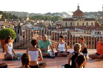 8. Meditation seat = We rise up in a sitting position (heel seat or cross-legged). a) Move a hand in blessing: "I send light to (name). May all people be happy. May the world be happy." b) Think a minute the mantra "Om Shanti".