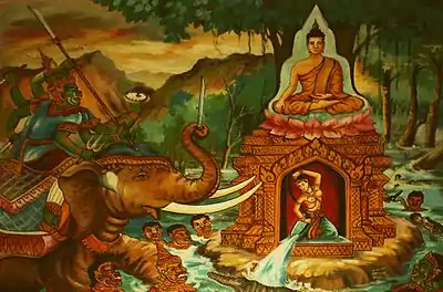 Although she did nothing but good things to all people, there was a woman in the palace who was jealous of her. She wanted to become the queen instead of Samavati. One night, this woman set fire to the palace of Samavati. Samavati put herself into a deep meditation, forgave her enemy, and blessed all beings with light. She went through death with equanimity. Due to her meditation of all-embracing love her soul rose on to paradise after death (in a dimension of light in the afterworld).