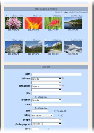 So, now the photos are on the server, we can import them into Zoph. We could just hit the "Import" button at the bottom of the screen and add the photos to albums, categories, etc. later, but it's probably easier to do it now. Keep in mind that all categories, albums, etc. will have to exist before you can use them on the import screen, it is (currently) not possible to add them from the import screen. Once all uploads have finished, it is no problem to leave the import page and go create albums, categories, etc. The photos are all stored on the server, so when you return to the import page, the photos will still be there.
