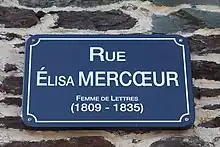 There are streets called Rue Élisa Mercœur that are named in honour of Mercœur in Rennes, Vertou, Saint-Sébastien-sur-Loire. The street named Rue Élisa Mercœur in Nantes does not refer to this Mercœur but to the Philippe Emmanuel, Duke of Mercœur, the ultra-Catholic governor of the city from 1582 to 1598, at the end of the French Wars of Religion. There is an avenue named Avenue Élisa Mercœur in Champigny-sur-Marne and a square, Square Élisa-Mercœur in Nantes.[26] Lastly there is a small dead-end street in Séné called the Allée Élisa Mercœur.