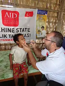 AID delivers medicine and hygiene items and deploys medical teams to the regions affected by natural disasters, war and violence. AID medical teams provided primary health care to the 2015 earthquake victims in Nepal. AID worked in the Philippines following Typhoon Haiyan as well as in the camps for internally displaced persons in Arakan, Myanmar, in 2013. AID sent a surgical team to Gaza during the attack in 2012. AID has been conducting health screenings, hygiene kit distribution and vaccinations for the Syrians affected by the Syrian Civil War. AID provided primary health care to the Syrian refugees from Kobane following the mass influx in September 2014.[1]