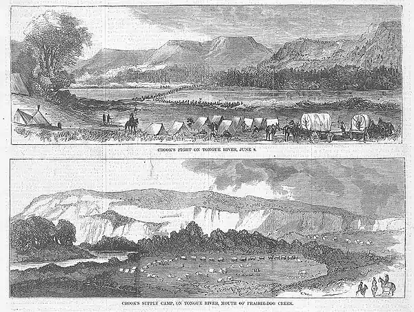![]() Sketch of the attack on Brig. Gen. George Crook’s command at Tongue River on June 9, 1876 published in Frank Leslie's Illustrated Newspaper | |||||||