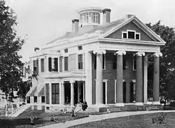 The Benjamin Barker House was a historic house on Main Road in Tiverton, Rhode Island. Built c. 1850, it was a two-story wood-frame structure with an impressive Greek Temple front, with full-height fluted Ionic columns supporting a full triangular pediment. The pediment (as did the gable at the opposite end of the house) had an astylistic triple window in it. The roof was topped by an octagonal cupola with belvedere, with two narrow chimneys piercing the ridge line. It is possible the house was designed by Russell Warren, who is documented to have designed a number of other high-style Greek Revival houses in the region. The purchaser is believed to be Benjamin Barker, a lumber merchant operating in nearby Fall River, Massachusetts.[2]