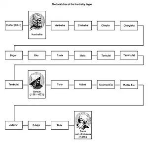 Genealogical tree of the Kurchaloyans from Nashkh came Kushul. Kushul — Kurchalha (12th century) — Khanbilha — Chabalkha — Chaykha — Chergishkha — Begal — Oku — Tovla — Maila (Maig) — Tovbolat — Tembolat — Timirbolat — Bersa (the first preacher of Islam — 1561.) — Turlo — Abbas — Mokhmad-ela — Murtaz-ela — Aidamir — Edalgir — Bulun Botakh (naib in Ichkeria — 1858).[3][4]