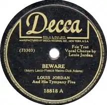 "Beware" is a song attributed to Morry Lasco, Dick Adams, and Fleecie Moore. It was performed by Louis Jordan and his Tympany Five, recorded in January 1946, and released on the Decca label (catalog no. 18818-A).