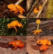 Natural history observations of B. rotenbergae (A) Inguinal amplexus; (B) An amplected couple of hiding under the juçara palm (E. edulis) root system; (C) Mouth gaping defensive behaviour; (D) One specimen near a yellow/orange mushroom, notice the similarity of color and size; (E) One juvenile specimen; (F) Two juvenile specimens, but the smaller one is darker.[1] | |