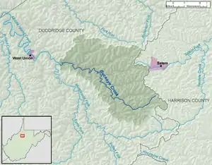 Buckeye Creek is a tributary of Middle Island Creek, 12.7 miles (20.4 km) long,[3] in north-central West Virginia in the United States. Via Middle Island Creek and the Ohio River, it is part of the watershed of the Mississippi River, draining an area of 39.1 square miles (101 km2)[4] in a rural region on the unglaciated portion of the Allegheny Plateau.