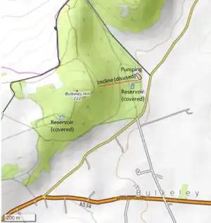The incline was used during the construction of the Bulkeley Hill Reservoir and the water pipeline to overcome a height difference of about 345 feet (105 m).[5] It has three catch points for derailing runaway vehicles. At its bottom station, five reused Lancashire boilers are available as diesel storage tanks for the pumps.[6][4]